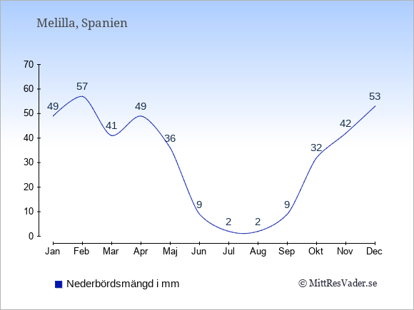 Vädret i Melilla är oftast bäst i de månader där det finns många soltimmar och få dagars nederbörd.