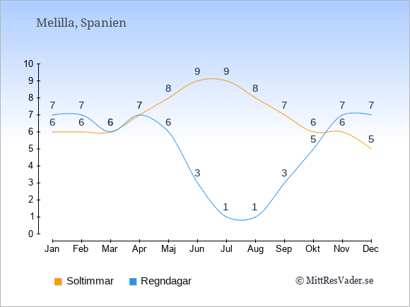 Grafen visar det genomsnittliga antalet soltimmar i Melilla under en viss månad (soltimmar är det antalet timmar per dag där solen skinnar), och antalet regndagar (dvs. det genomsnittliga antalet dagar