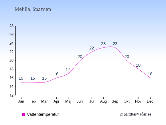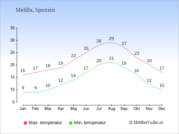 Grafen visar de genomsnittligt högsta temperaturerna i Melilla (vanligtvis det värde som uppmätts mitt på dagen) och de genomsnittligt lägsta temperaturer (vanligtvis tidpunkten just innan soluppgång).