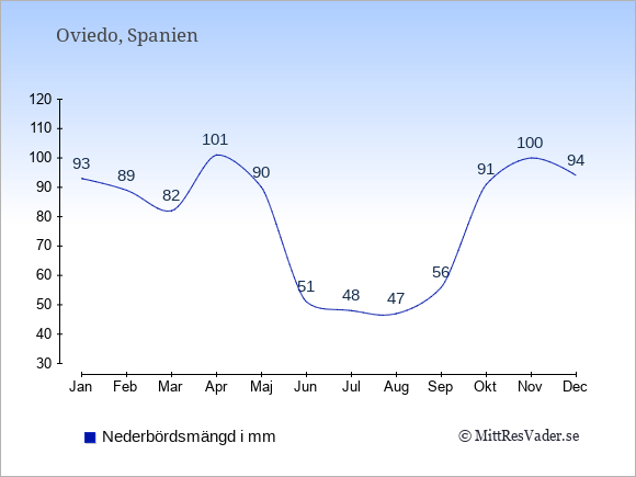 För att se hur vädret i Oviedo skiljer sig från vädret hemma, kan du också jämföra siffrorna måned för måned med motsvarande siffror för Sverige under samma period här: Oviedos klimat.