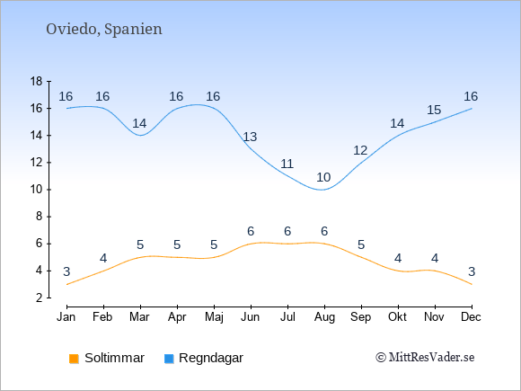 Grafen visar det genomsnittliga antalet soltimmar i Oviedo under en viss månad (soltimmar är det antalet timmar per dag där solen skinnar), och antalet regndagar (dvs. det genomsnittliga antalet dagar