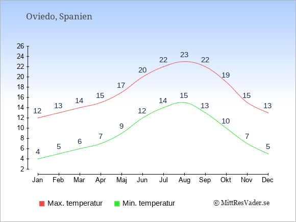 Grafen visar de genomsnittligt högsta temperaturerna i Oviedo (vanligtvis det värde som uppmätts mitt på dagen) och de genomsnittligt lägsta temperaturer (vanligtvis tidpunkten just innan soluppgång).