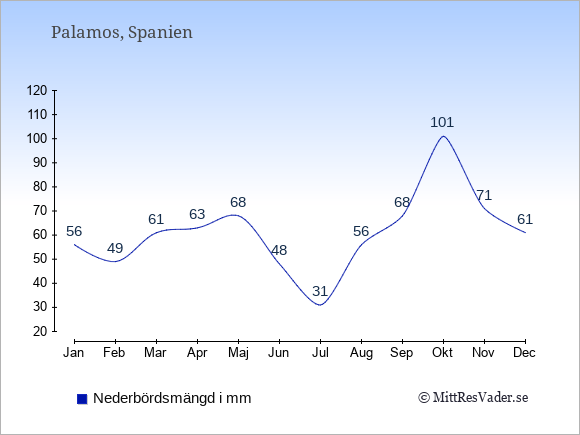 Vädret i Palamos är oftast bäst i de månader där det finns många soltimmar och få dagars nederbörd.