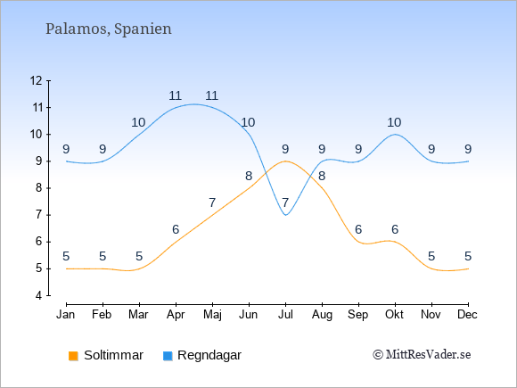 Grafen visar det genomsnittliga antalet soltimmar i Palamos under en viss månad (soltimmar är det antalet timmar per dag där solen skinnar), och antalet regndagar (dvs. det genomsnittliga antalet dagar