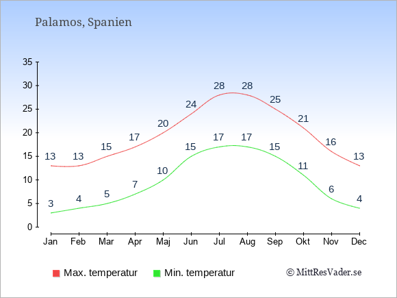 Grafen visar de genomsnittligt högsta temperaturerna i Palamos (vanligtvis det värde som uppmätts mitt på dagen) och de genomsnittligt lägsta temperaturer (vanligtvis tidpunkten just innan soluppgång).
