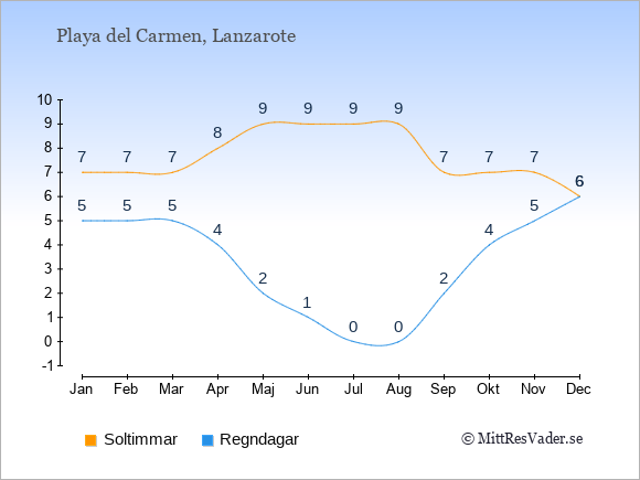 Grafen visar det genomsnittliga antalet soltimmar i Playa del Carmen under en viss månad (soltimmar är det antalet timmar per dag där solen skinnar), och antalet regndagar (dvs. det genomsnittliga antalet dagar