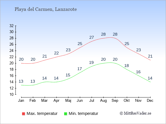 Grafen visar de genomsnittligt högsta temperaturerna i Playa del Carmen (vanligtvis det värde som uppmätts mitt på dagen) och de genomsnittligt lägsta temperaturer (vanligtvis tidpunkten just innan soluppgång).