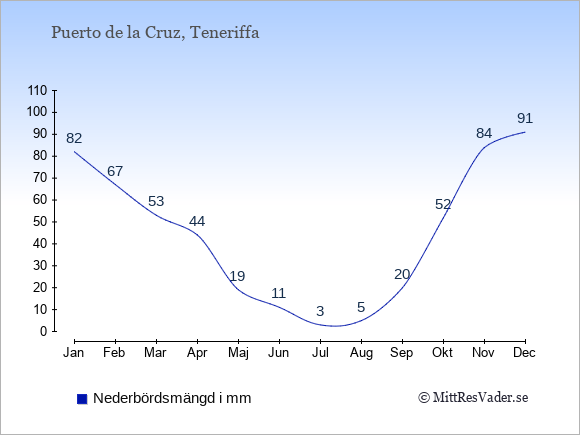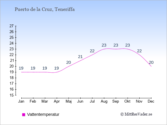 För att se hur vädret i Puerto de la Cruz skiljer sig från vädret hemma, kan du också jämföra siffrorna måned för måned med motsvarande siffror för Sverige under samma period här: Puerto de la Cruz klimat.