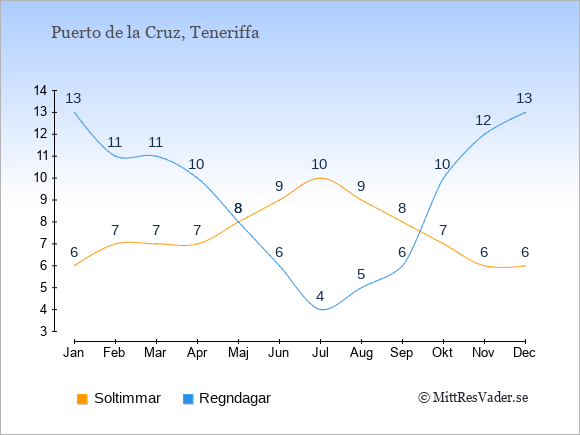 Grafen visar det genomsnittliga antalet soltimmar i Puerto de la Cruz under en viss månad (soltimmar är det antalet timmar per dag där solen skinnar), och antalet regndagar (dvs. det genomsnittliga antalet dagar