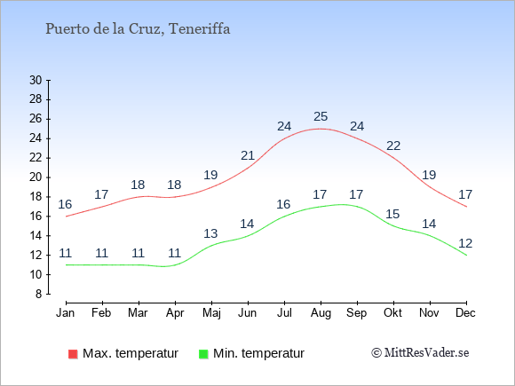 Grafen visar de genomsnittligt högsta temperaturerna i Puerto de la Cruz (vanligtvis det värde som uppmätts mitt på dagen) och de genomsnittligt lägsta temperaturer (vanligtvis tidpunkten just innan soluppgång).