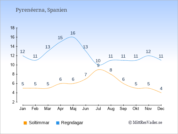 Grafen visar det genomsnittliga antalet soltimmar i Pyrenéerna under en viss månad (soltimmar är det antalet timmar per dag där solen skinnar), och antalet regndagar (dvs. det genomsnittliga antalet dagar