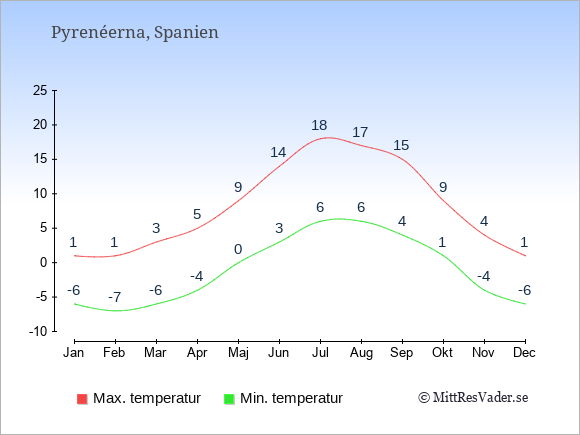 Grafen visar de genomsnittligt högsta temperaturerna i Pyrenéerna (vanligtvis det värde som uppmätts mitt på dagen) och de genomsnittligt lägsta temperaturer (vanligtvis tidpunkten just innan soluppgång).