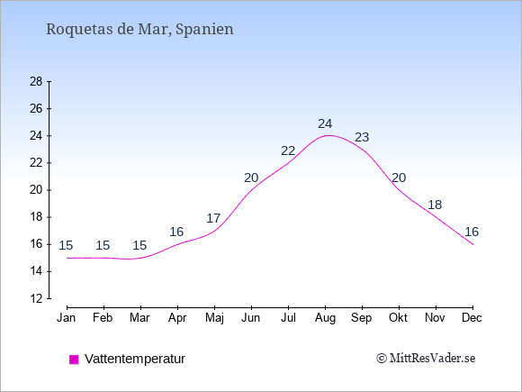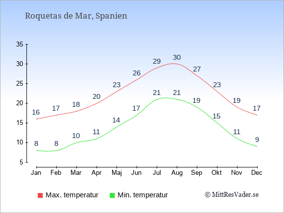 Grafen visar de genomsnittligt högsta temperaturerna i Roquetas de Mar (vanligtvis det värde som uppmätts mitt på dagen) och de genomsnittligt lägsta temperaturer (vanligtvis tidpunkten just innan soluppgång).