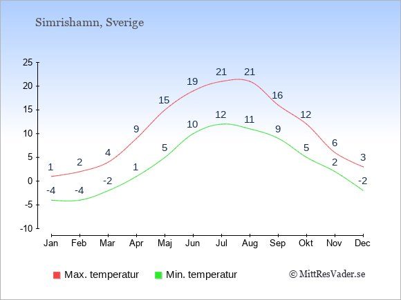 Graferna visar de genomsnittligt högsta temperaturerna i Simrishamn och Stockholm (typiskt när solen står högst på himlen på eftermiddagen)