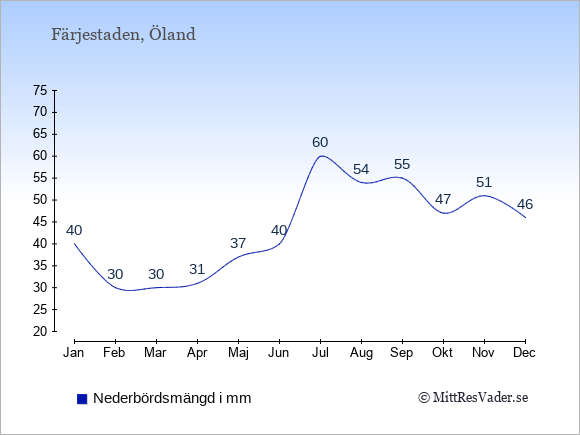 För att se hur vädret i Färjestaden skiljer sig från vädret i Stockholm, kan du också jämföra siffrorna måned för måned med motsvarande siffror för Stockholm under samma period här: Färjestadens klimat.