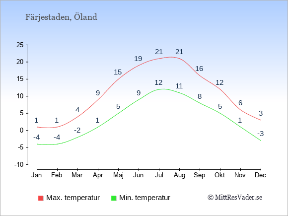 Grafen visar de genomsnittligt högsta temperaturerna i Färjestaden (vanligtvis det värde som uppmätts mitt på dagen) och de genomsnittligt lägsta temperaturer (vanligtvis tidpunkten just innan soluppgång).