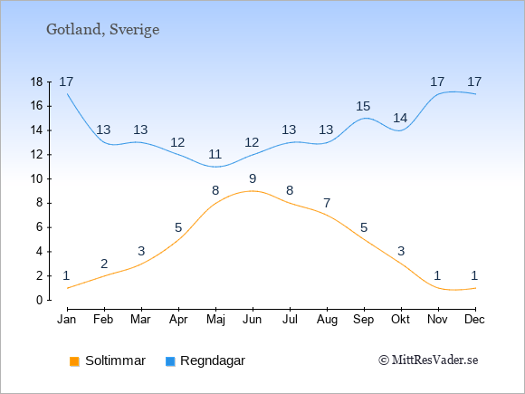 Grafen visar det genomsnittliga antalet soltimmar på Gotland under en viss månad (soltimmar är det antalet timmar per dag där solen skinnar), och antalet regndagar (dvs. det genomsnittliga antalet dagar