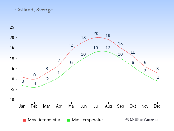 Grafen visar de genomsnittligt högsta temperaturerna på Gotland (vanligtvis det värde som uppmätts mitt på dagen) och de genomsnittligt lägsta temperaturer (vanligtvis tidpunkten just innan soluppgång).