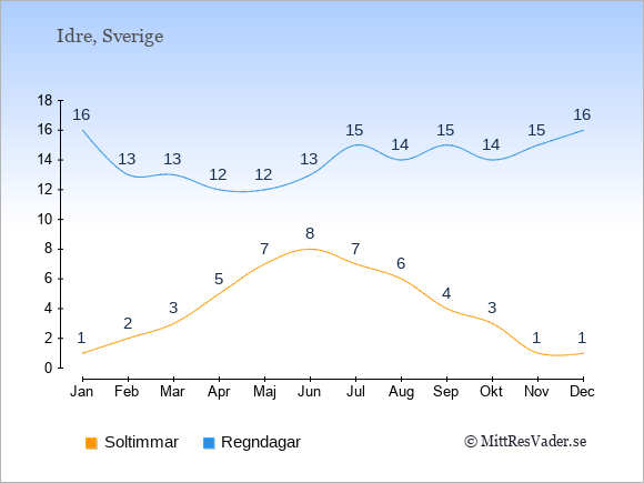 Grafen visar det genomsnittliga antalet soltimmar i Idre under en viss månad (soltimmar är det antalet timmar per dag där solen skinnar), och antalet regndagar (dvs. det genomsnittliga antalet dagar