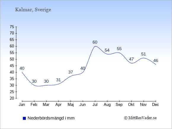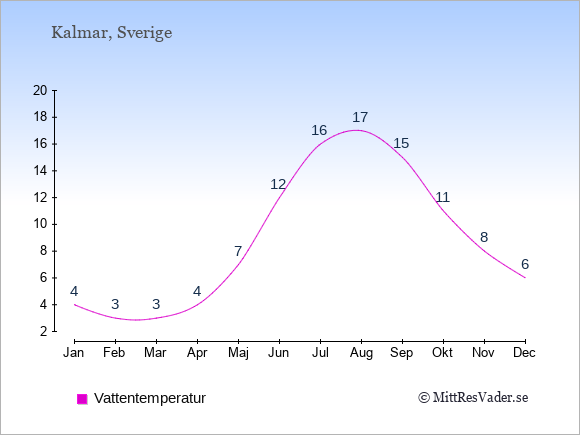 Få en överblick över vädret i Kalmar månad för månad med temperaturer, vattentemperatur, soltimmar och nederbörd.