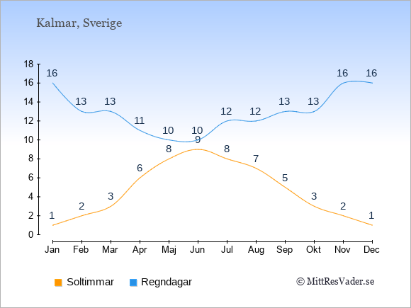 Grafen visar det genomsnittliga antalet soltimmar i Kalmar under en viss månad (soltimmar är det antalet timmar per dag där solen skinnar), och antalet regndagar (dvs. det genomsnittliga antalet dagar