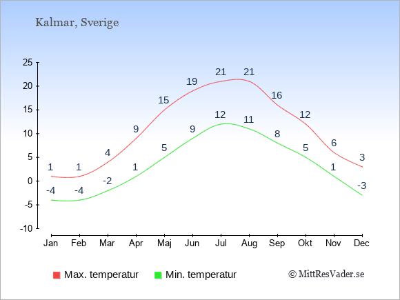 Grafen visar de genomsnittligt högsta temperaturerna i Kalmar (vanligtvis det värde som uppmätts mitt på dagen) och de genomsnittligt lägsta temperaturer (vanligtvis tidpunkten just innan soluppgång).
