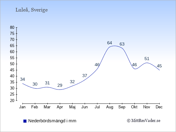 För att se hur vädret i Luleå skiljer sig från vädret i Stockholm, kan du också jämföra siffrorna måned för måned med motsvarande siffror för Stockholm under samma period här: Luleås klimat.