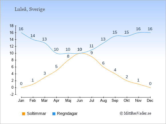 Grafen visar det genomsnittliga antalet soltimmar i Luleå under en viss månad (soltimmar är det antalet timmar per dag där solen skinnar), och antalet regndagar (dvs. det genomsnittliga antalet dagar
