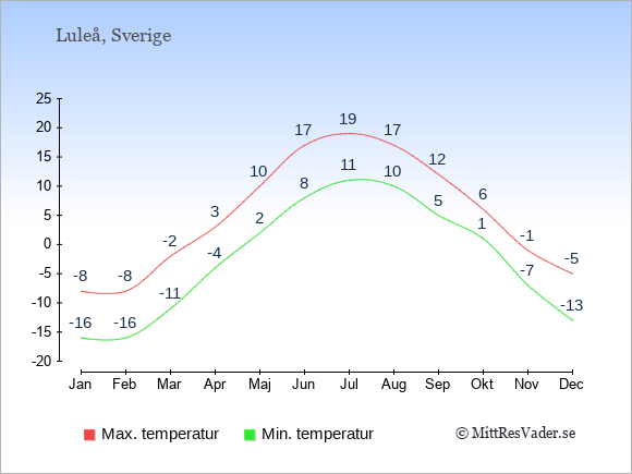 Grafen visar de genomsnittligt högsta temperaturerna i Luleå (vanligtvis det värde som uppmätts mitt på dagen) och de genomsnittligt lägsta temperaturer (vanligtvis tidpunkten just innan soluppgång).