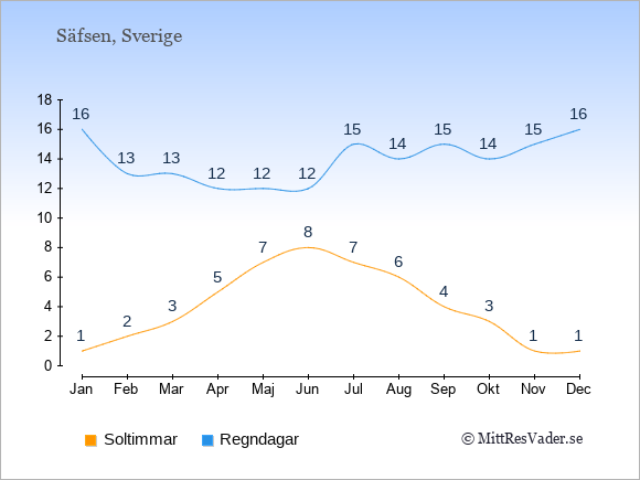Grafen visar det genomsnittliga antalet soltimmar i Säfsen under en viss månad (soltimmar är det antalet timmar per dag där solen skinnar), och antalet regndagar (dvs. det genomsnittliga antalet dagar