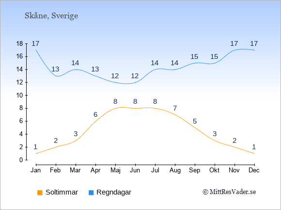 Grafen visar det genomsnittliga antalet soltimmar i Skåne under en viss månad (soltimmar är det antalet timmar per dag där solen skinnar), och antalet regndagar (dvs. det genomsnittliga antalet dagar