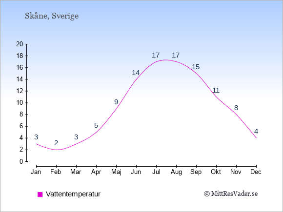Få en överblick över vädret i Skåne månad för månad med temperaturer, vattentemperatur, soltimmar och nederbörd.