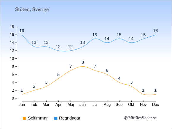 Grafen visar det genomsnittliga antalet soltimmar i Stöten under en viss månad (soltimmar är det antalet timmar per dag där solen skinnar), och antalet regndagar (dvs. det genomsnittliga antalet dagar