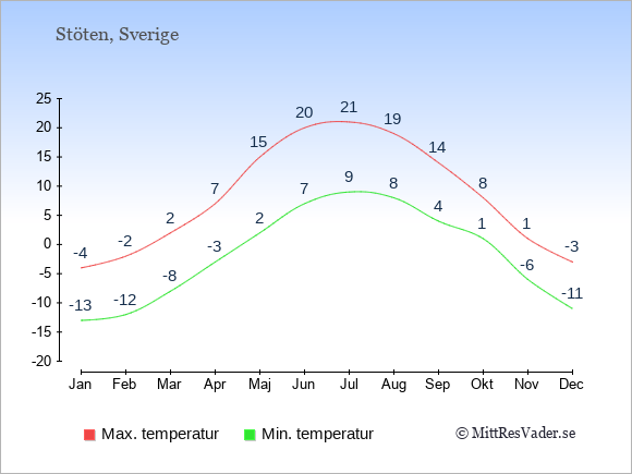 Grafen visar de genomsnittligt högsta temperaturerna i Stöten (vanligtvis det värde som uppmätts mitt på dagen) och de genomsnittligt lägsta temperaturer (vanligtvis tidpunkten just innan soluppgång).