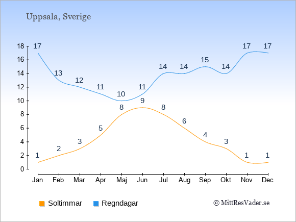 Grafen visar det genomsnittliga antalet soltimmar i Uppsala under en viss månad (soltimmar är det antalet timmar per dag där solen skinnar), och antalet regndagar (dvs. det genomsnittliga antalet dagar