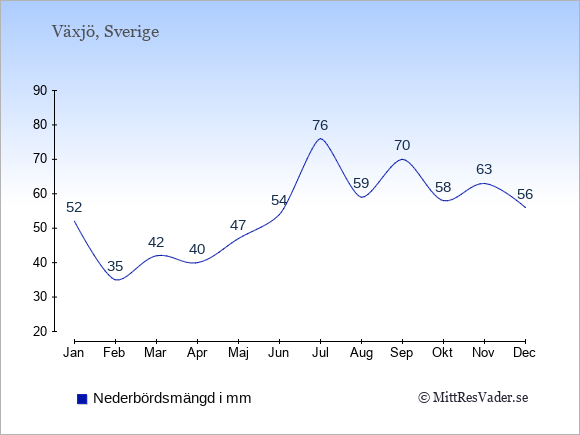 Få en överblick över vädret i Växjö månad för månad med temperaturer, soltimmar och nederbörd.