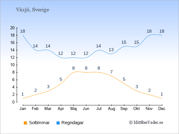 Grafen visar det genomsnittliga antalet soltimmar i Växjö under en viss månad (soltimmar är det antalet timmar per dag där solen skinnar), och antalet regndagar (dvs. det genomsnittliga antalet dagar