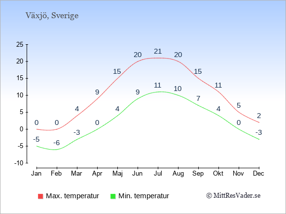 Grafen visar de genomsnittligt högsta temperaturerna i Växjö (vanligtvis det värde som uppmätts mitt på dagen) och de genomsnittligt lägsta temperaturer (vanligtvis tidpunkten just innan soluppgång).