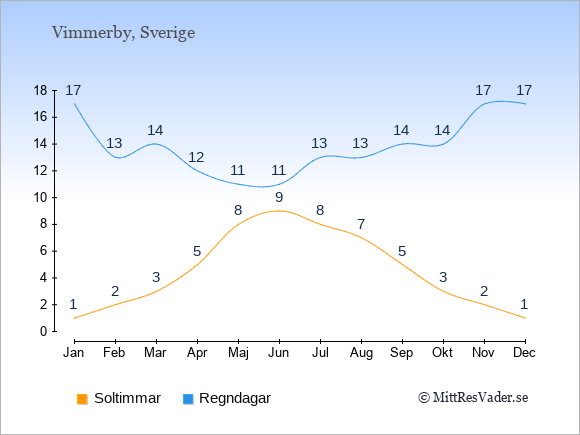 Grafen visar det genomsnittliga antalet soltimmar i Vimmerby under en viss månad (soltimmar är det antalet timmar per dag där solen skinnar), och antalet regndagar (dvs. det genomsnittliga antalet dagar