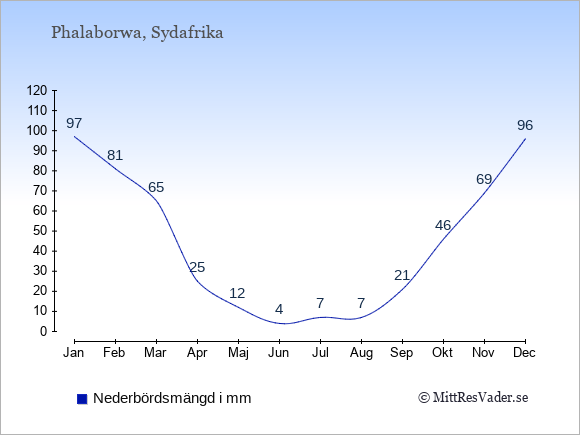 För att se hur vädret i Phalaborwa skiljer sig från vädret hemma, kan du också jämföra siffrorna måned för måned med motsvarande siffror för Sverige under samma period här: Phalaborwas klimat.