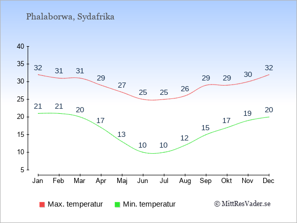 Grafen visar de genomsnittligt högsta temperaturerna i Phalaborwa (vanligtvis det värde som uppmätts mitt på dagen) och de genomsnittligt lägsta temperaturer (vanligtvis tidpunkten just innan soluppgång).