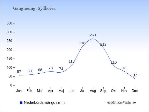 För att se hur vädret i Gangneung skiljer sig från vädret hemma, kan du också jämföra siffrorna måned för måned med motsvarande siffror för Sverige under samma period här: Gangneungs klimat.