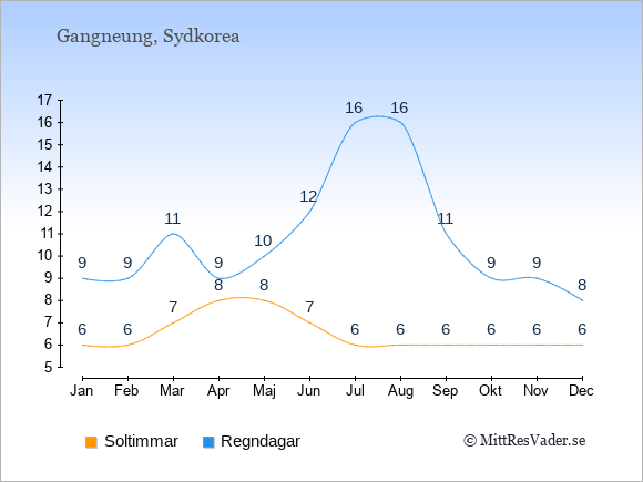 Väder i Gangneung: Soltimmar och regndagar