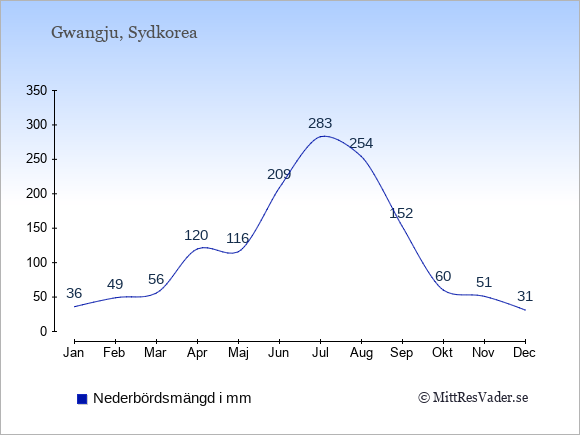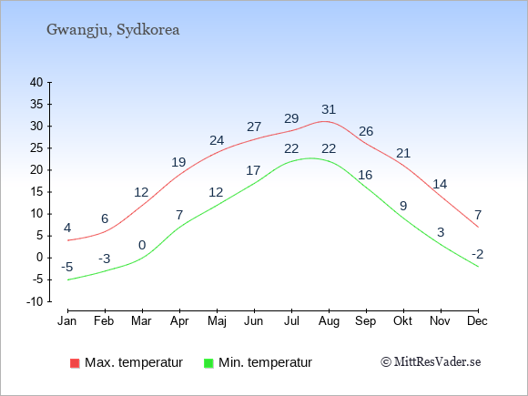 För att se hur vädret i Gwangju skiljer sig från vädret hemma, kan du också jämföra siffrorna måned för måned med motsvarande siffror för Sverige under samma period här: Gwangjus klimat.