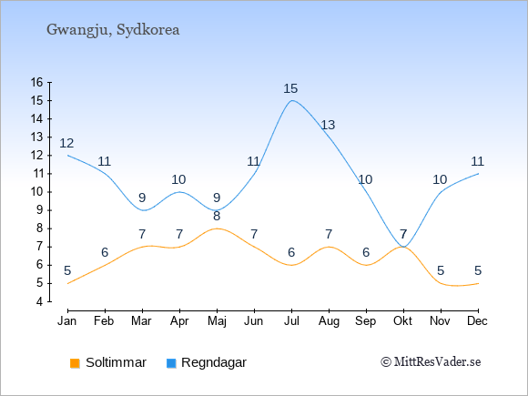 Grafen visar det genomsnittliga antalet soltimmar i Gwangju under en viss månad (soltimmar är det antalet timmar per dag där solen skinnar), och antalet regndagar (dvs. det genomsnittliga antalet dagar