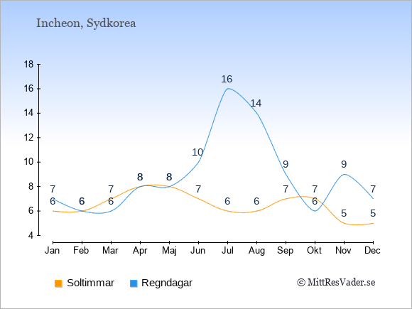 Grafen visar det genomsnittliga antalet soltimmar i Incheon under en viss månad (soltimmar är det antalet timmar per dag där solen skinnar), och antalet regndagar (dvs. det genomsnittliga antalet dagar