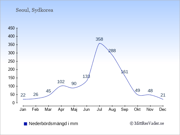 För att se hur vädret i Seoul skiljer sig från vädret hemma, kan du också jämföra siffrorna måned för måned med motsvarande siffror för Sverige under samma period här: Seouls klimat.