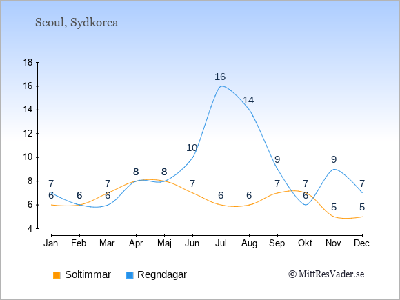 Grafen visar det genomsnittliga antalet soltimmar i Seoul under en viss månad (soltimmar är det antalet timmar per dag där solen skinnar), och antalet regndagar (dvs. det genomsnittliga antalet dagar