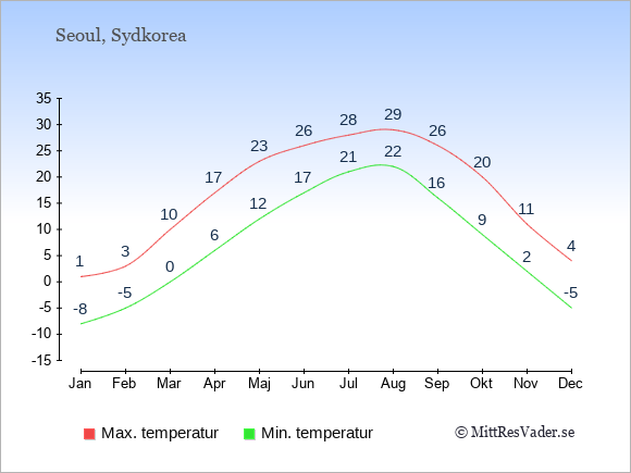 Grafen visar de genomsnittligt högsta temperaturerna i Seoul (vanligtvis det värde som uppmätts mitt på dagen) och de genomsnittligt lägsta temperaturer (vanligtvis tidpunkten just innan soluppgång).