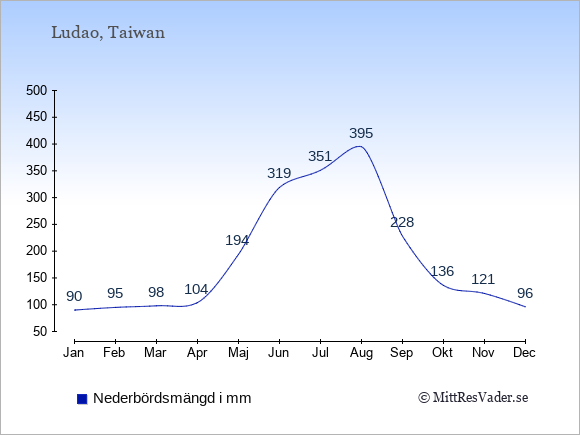 För att se hur vädret på Ludao skiljer sig från vädret hemma, kan du också jämföra siffrorna måned för måned med motsvarande siffror för Sverige under samma period här: Ludaos klimat.